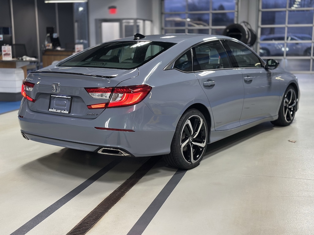 The 2022 Honda Accord Sport is a popular trim in the midsize sedan segment, offering a compelling blend of style and performance. It comes standard with a 1.5-liter turbocharged 4-cylinder engine producing 192 horsepower and 192 lb-ft of torque, paired with a Continuously Variable Transmission (CVT) and paddle shifters. An available upgrade for the Sport trim is a more powerful 2.0-liter turbocharged 4-cylinder engine with 252 horsepower and 273 lb-ft of torque, mated to a smooth 10-speed automatic transmission. The Sport trim features distinct exterior styling, including a gloss black decklid spoiler, dark chrome grille, and larger 19-inch alloy wheels. Standard interior features include an 8-inch Display Audio touchscreen with Apple CarPlay and Android Auto integration, dual-zone automatic climate control, a 12-way power driver's seat, and the Honda Sensing suite of safety and driver-assistance technologies!
